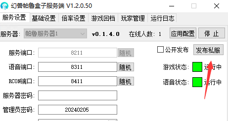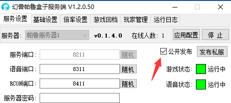 勾选公开发布,既可将该私服发布到外网,外网玩家既可以连接玩耍本网吧师私服(不想公开的别勾选)