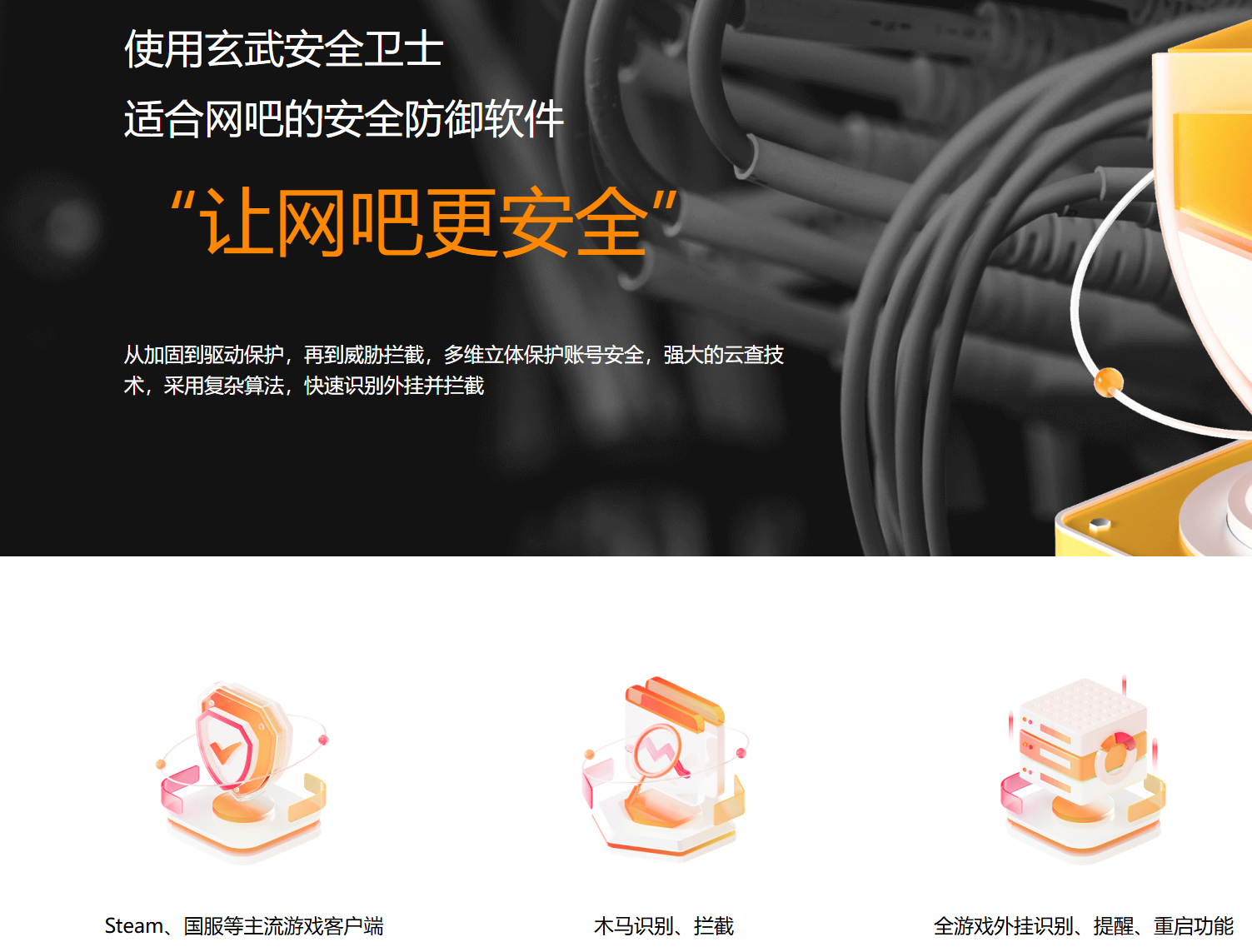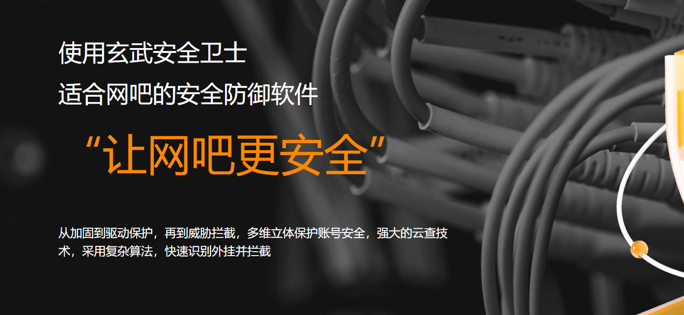 从加固到驱动保护,再到威胁拦截,多维立体保护账号安全,强大的云查技术,采用复杂算法,快速识别外挂并拦截,使用玄武安全卫士,让网吧更安全!