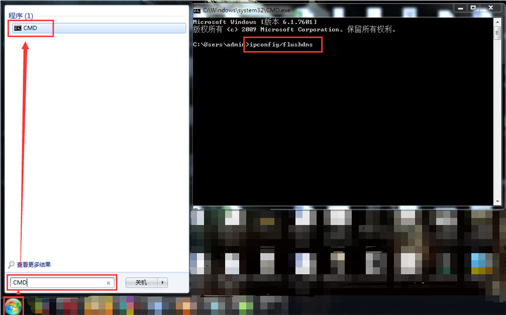 · Win7用户点击开始按钮,搜索CMD,并右键以管理员身份运行,然后输入netsh winsock reset,回车。